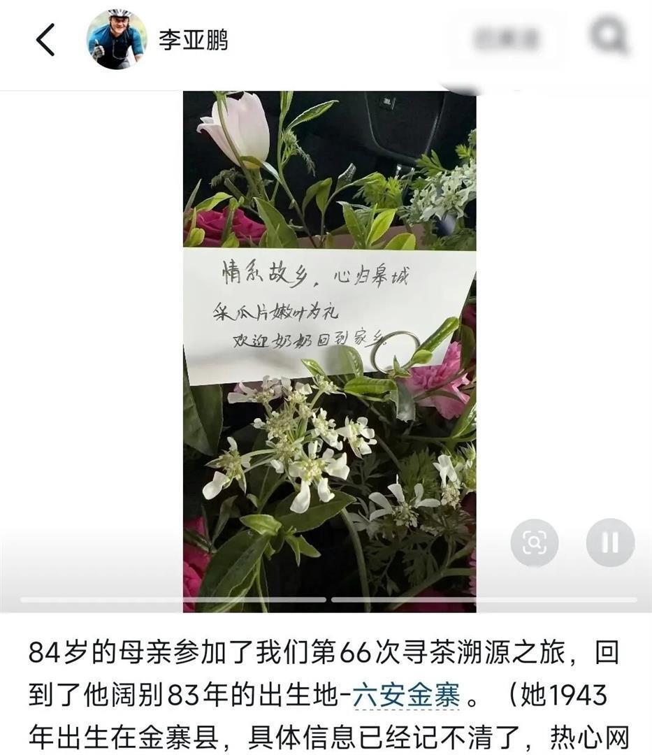 2026年4月15日,李亚鹏在社交账号发文说:“84岁的母亲参加了我们第66次寻茶溯源之旅,回到了她阔别83年的出生地六安金寨。”母亲原名叫凌碧,后来改名张平。她1943年或者1944年在金寨出生,还没满两岁就跟着家人离开了家乡。