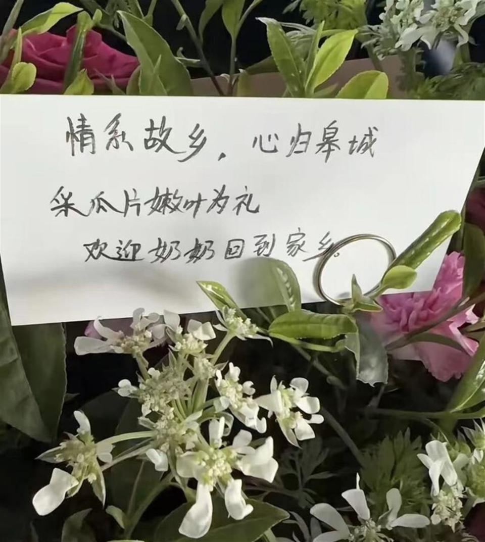 到达合肥新桥机场时,有工作人员准备了特别的花束迎接。花束上写着“情系故乡,心归皋城,采瓜片嫩叶为礼,欢迎奶奶回到家乡”。六安瓜片是当地的特色名茶,用嫩叶作为欢迎礼,既体现了家乡特产,也充满了仪式感。